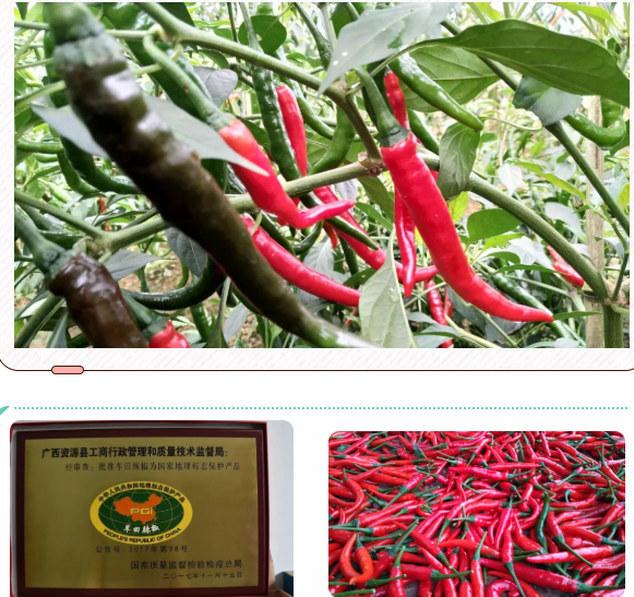 辣椒中含有豐富的維生素、膳食纖維和人體所需的礦物質(zhì)。資源辣椒具有健胃消食,預(yù)防膽結(jié)石,改善心臟功能預(yù)防心血管疾病的功效。辣椒在資源縣種植與食用歷史悠遠(yuǎn),人們常用來開胃消食增進(jìn)食欲,暖胃驅(qū)寒除風(fēng)發(fā)汗,是資源人每餐必備的佳肴。資源辣椒,皮薄肉厚,幼嫩時(shí)采摘謂之青椒,青翠欲滴,常伴五花肉清炒,辣中帶甜讓人胃口大開;成熟后采摘謂之紅椒,嬌艷似火,至于泡菜壇中月余后,清脆爽口,從舌尖就能感覺到,全身的血液循環(huán);紅椒除去水份后謂之干紅椒,紅得發(fā)紫,薄若鏡面果皮,包裹的辣椒素嬌艷欲滴,是干炒拌料的佳品。