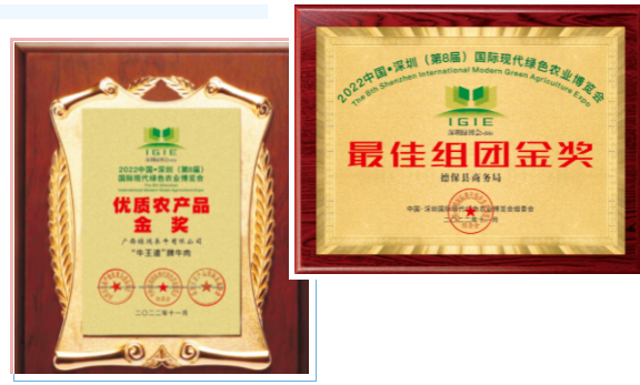 德??h商務(wù)局榮獲最佳組團(tuán)金獎(jiǎng)、德??h湘里食品有限公司總經(jīng)理胡朝霞、廣西綠鴻養(yǎng)牛有限公司董事長朱慧琳獲得中國現(xiàn)代農(nóng)業(yè)領(lǐng)軍人物獎(jiǎng)、廣西綠鴻養(yǎng)牛有限公司、“牛王道”牌牛肉獲得2022年中國·深圳(第8屆)國際現(xiàn)代綠色農(nóng)業(yè)博覽會(huì)優(yōu)質(zhì)農(nóng)產(chǎn)品金獎(jiǎng)。