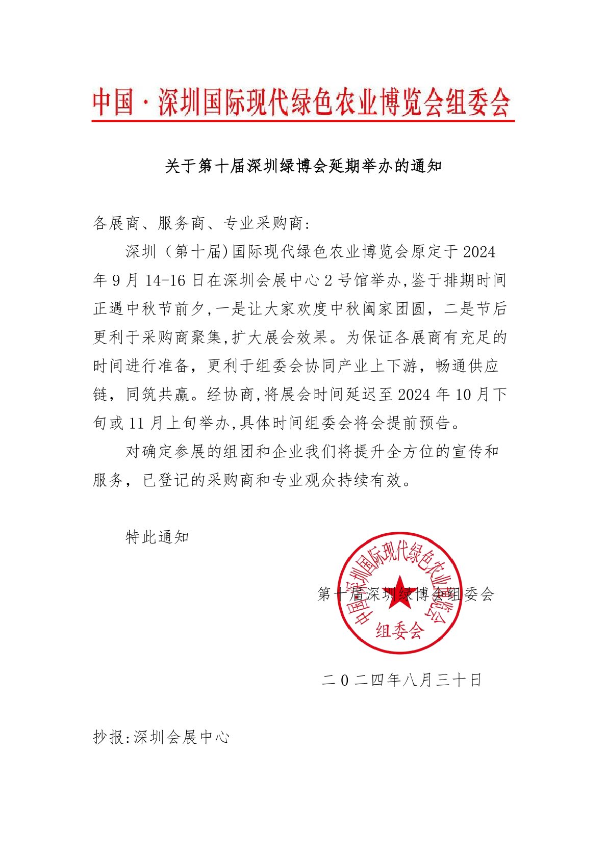 關(guān)于第十屆深圳國際現(xiàn)代綠色農(nóng)業(yè)博覽會延期舉辦的通知